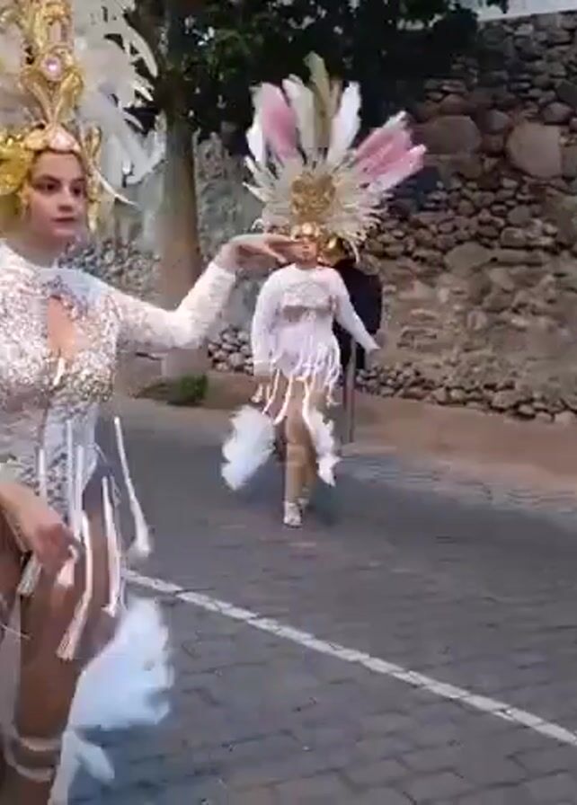 group of women performing in a parade or street performance. They are dressed in elaborate costumes with white, shiny, and fringed bodysuits and large headpieces decorated with feathers. The colors of the feathers are primarily white and pale pink. The dancers are moving in sync, with synchronized arm movements and steps, down a street paved with cobblestones. Some people are watching in the background. There are buildings and trees visible along the side of the street, and cars can be seen parked alongside the parade. The atmosphere seems lively and festive.