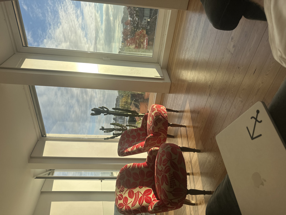 The image depicts an interior living space in Lordelo do Ouro e Massarelos, Portugal, observed during what appears to be late afternoon or early morning sunlight. Two upholstered armchairs with a red and beige floral pattern are positioned in the midground, facing towards a series of large, white-framed windows. The floor is light-colored hardwood, reflecting the sunlight that streams in from the right. In the foreground, a silver-colored laptop, featuring an Apple logo and a black Sagittarius zodiac symbol sticker (an arrow with a crossbar), rests on a dark-colored surface, likely a sofa or armrest, indicating human presence without a person being visible. Beyond the windows, an outdoor scene is visible. A prominent, multi-stemmed cactus stands directly outside the windows. Further in the distance, a landscape of residential buildings with varying rooflines, autumnal trees displaying red and orange foliage, and a calm body of water, likely the Douro River, can be seen under a partly cloudy sky with scattered white clouds. The bright sunlight creates strong highlights and shadows within the room. No individuals are depicted.