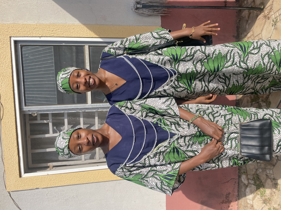 Two adult females are standing outdoors, positioned centrally in the frame against a building. The location is in the city of Unknown, Unknown. Both individuals appear to be identical twins, approximately in their twenties, with dark complexions. They are dressed in matching attire consisting of long, short-sleeved dresses featuring a green leaf and white wavy line pattern on a dark background, accented with a solid navy blue V-neck yoke from which three lines of silver-colored beads or chains are draped. Matching headwraps cover their hair. The woman on the left has a neutral facial expression with slightly parted lips, a small silver nose piercing on her right nostril, and dark lipstick. She wears a silver ring on her left ring finger and a green and gold patterned bracelet on her left wrist. Her hands are clasped in front, holding a black, pleated clutch purse with a silver clasp. The woman on the right is smiling, showing her teeth. She wears a thin gold necklace with a black square clover-shaped pendant and a matching gold bracelet with four black clover charms on her left wrist. A black handbag with gold hardware is slung over her left shoulder. The background consists of a light yellow building wall with a rectangular window featuring vertical blinds or grates. Below the window, the wall transitions to a reddish-brown color. The ground beneath the individuals is a light-colored, uneven surface. To the far right, a string mop head is partially visible hanging against the wall. The scene is illuminated by bright sunlight, casting shadows on the wall and ground, indicating daytime.