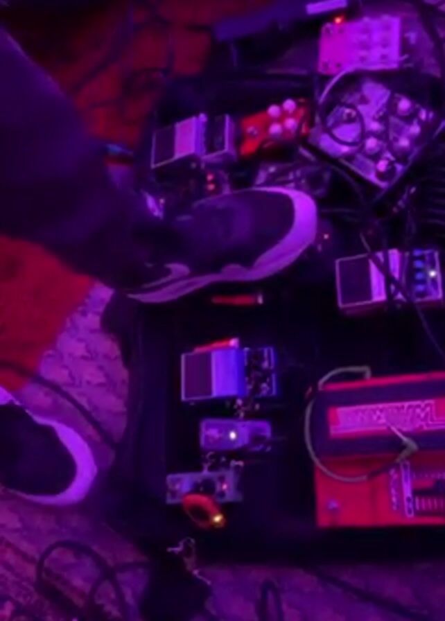 person standing over a black pedalboard covered in various guitar effect pedals