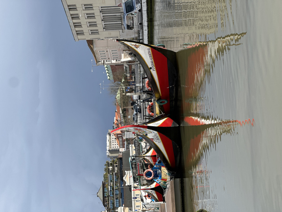 - "The image displays a row of at least five traditional Portuguese Moliceiro boats docked along a canal in the city of Aveiro, Portugal" by FM-5WnvD2, licensed under CC BY 4.0