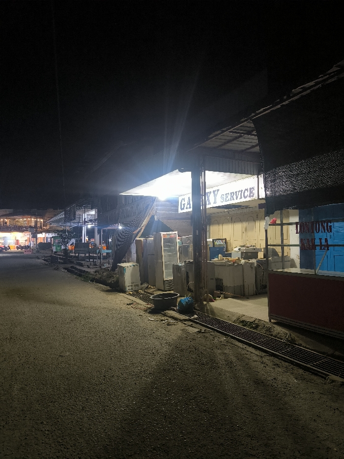 This image depicts a nighttime street scene in Manetunong, Indonesia. An asphalt road occupies the foreground and extends into the distance on the left. Alongside the road, a sidewalk features a metal-grated drainage ditch. The primary subject is an open-front commercial establishment located in the right-midground, prominently illuminated by an overhead light and a sign that reads "GALAXY SERVICE." This shop contains and is fronted by multiple large appliances, including refrigerators and washing machines. To the immediate right, a partially visible stall features a red counter and a blue section with text that appears to include "LONTONG KAK LA." Further down the street on the left, a row of other commercial buildings, dimly lit with various internal and external light sources, is discernible. No individuals are present in the visible scene.