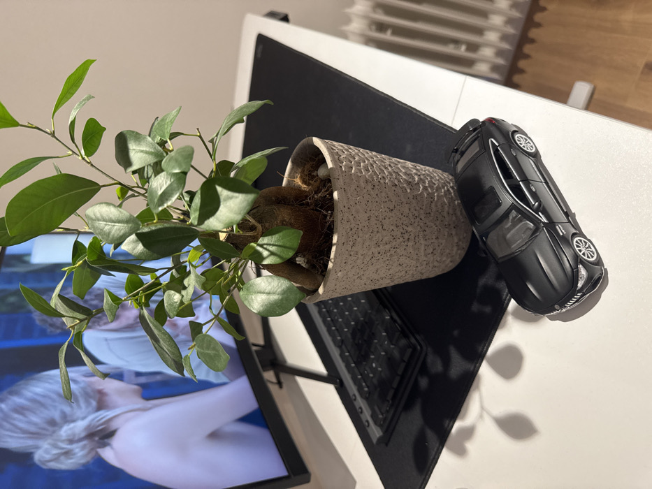 The image displays an indoor desk setup in Forbach, Germany. In the foreground, on a white desk surface, a black die-cast model car, consistent with a Mercedes-AMG GT 4-door Coupe, is positioned facing left. Behind the model car and slightly to its left, a light-colored, textured ceramic pot holds a green plant with visible roots above the soil line. Further back, a black computer keyboard rests on a large black mouse pad. Dominating the upper left background is a black-framed computer monitor, angled slightly. The monitor screen displays a scene featuring two individuals: the left figure is a blonde-haired person, viewed from behind with a bare shoulder, facing towards a second, less distinct individual. Strong directional light from the right side of the frame casts prominent shadows of the plant and keyboard onto the desk and mouse pad. A white, ribbed radiator is partially visible against a light wall in the far right background.