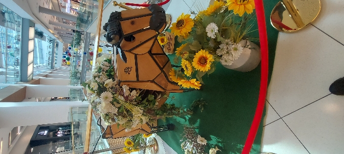 A decorative horse statue, pieced together from tan-colored panels, stands adorned with sunflowers and white daisies. The statue is placed on a green surface, bordered by a red rope. In the background, a multi-level shopping mall is visible, filled with various retail stores. The scene is well-lit.