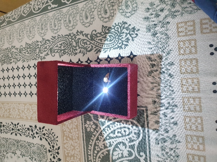 An open, square-shaped, glitter-covered red jewelry box rests on a patterned fabric surface. Inside the box, a black velvet or foam insert holds a gold-toned ring with a prominent, round, clear gemstone. The gemstone strongly reflects light, creating a bright starburst effect at its center. The fabric beneath the box features an intricate design with paisley, floral, and geometric patterns in shades of off-white, beige, and dark green. No individuals or active interactions are visible in the scene.