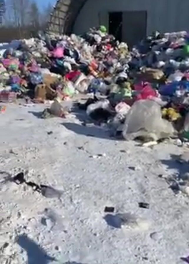 large pile of garbage outside of a building on a sunny day. The ground is covered in snow and trash. The garbage pile is large and colorful, and appears to be made up of different types of materials, including clothing, plastic, and other household items. The building behind the pile is large and has a curved roof. The sky is blue and there are trees in the background. A forklift is visible in the background on the left side. The scene is littered with debris.