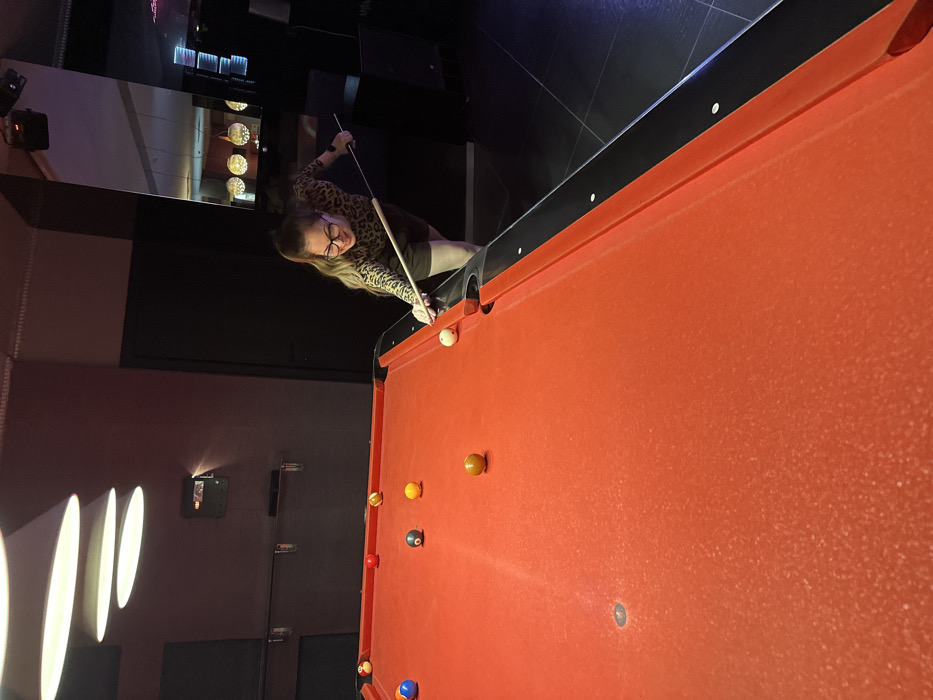 The scene depicts an indoor pool hall or recreational area in the city of Devin, Bulgaria. A single female individual, with long light-colored hair pulled back and wearing glasses, a leopard print top, and a dark skirt/shorts, is positioned on the right side of a red-felted pool table. She is actively engaged in playing pool, holding a wooden cue stick with both hands and aiming it at a white cue ball situated near the table's right rail. Her posture is bent over the table, and she exhibits a focused expression with a slight smile. Multiple pool balls are distributed across the red felt surface, including a yellow ball, a red ball, a blue ball, a black ball, and an orange ball, in addition to the white cue ball. The red felt shows signs of wear or dusting. The immediate environment includes a dark, tiled floor and dark walls. Overhead on the left, three inverted cone-shaped white light fixtures are suspended. A wall-mounted electronic device and horizontal chrome railings are visible on the left wall. A dark door is present in the mid-background. On the right, a large vertical mirror reflects portions of the ceiling, including spherical light fixtures, and contributes to the dimly lit ambiance of the room. The overall lighting is artificial and subdued.