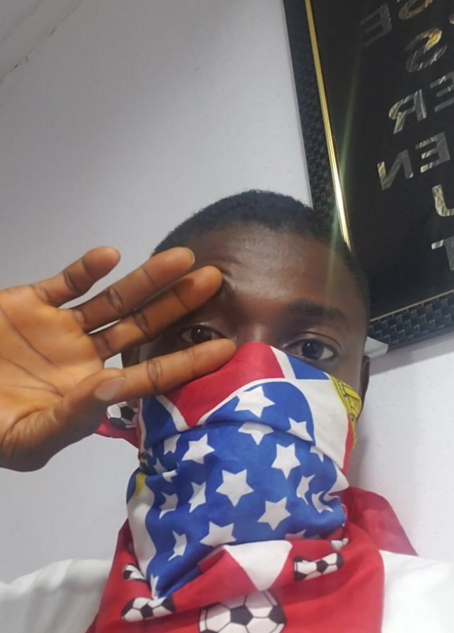An individual with dark skin is looking into the camera, with the lower half of their face covered by a scarf patterned with stars and stripes resembling the American flag and some soccer balls. They are raising their right hand, palm facing the camera. The background includes a white wall, a framed object with text on it, and a white shirt. The lighting is bright.