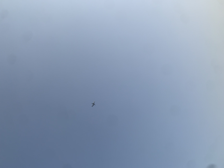 The image displays a clear, light blue sky over Karsana 2, Nigeria. A single, small, white or light-colored aircraft, consistent with a twin-engine jet, is visible in flight in the upper-left quadrant, moving horizontally from left to right. The sky exhibits a slight gradient, becoming lighter towards the lower right. Several indistinct, dark smudges are present across the sky, consistent with lens or sensor artifacts. No people, ground features, or further objects are discernible in the scene.