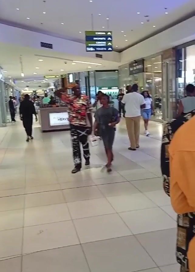 interior of a brightly lit shopping mall, with many people walking through the hallway. There are various retail stores lining the sides of the hallway, with glass fronts displaying merchandise. Overhead signage directs patrons to different areas like cinema, food court, restrooms, and the "Heaven" kiosk. Several individuals are seen walking casually, some in groups, others alone. Their attire varies, but all seem to be dressed for casual shopping. The floors are tiled in a light color, contributing to the overall bright and clean atmosphere. The mall appears busy with typical pedestrian traffic.