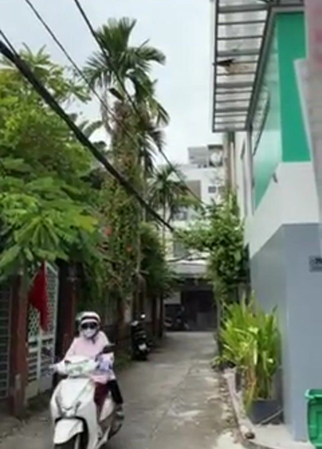 narrow alleyway, lined with buildings and vegetation, under a cloudy sky. The alleyway is paved with concrete and is bordered by a brick wall and a white building with a teal accent. Lush green plants and trees grow along the sides, including tall palm trees and flowering vines. Power lines are visible overhead, crisscrossing the sky. Initially, a person riding a white scooter travels down the alleyway. The person is wearing protective gear. After the scooter passes, the view remains focused down the alleyway, revealing a few parked motorbikes in the distance.