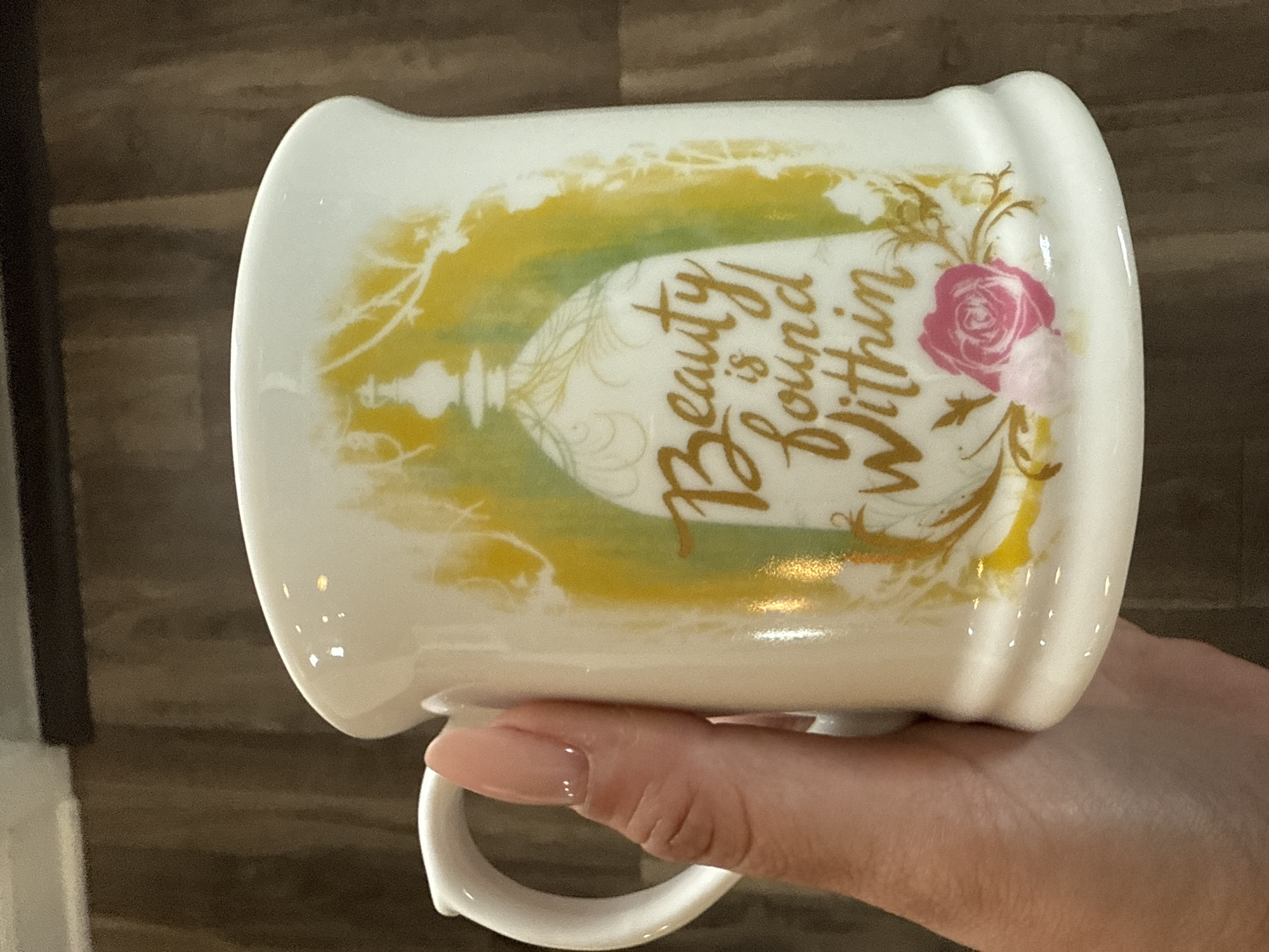 A white ceramic mug is being held in a person's hand. The mug is decorated with a design featuring a golden floral pattern, a pink rose, and the words "Beauty is found Within" in gold script. The background of the design has a yellow and green watercolor effect. The person holding the mug has neatly manicured nails painted with a light pink color. The background is a blurred brown surface resembling wood paneling or a tabletop. The location in the city of Orlando, United States is unknown.