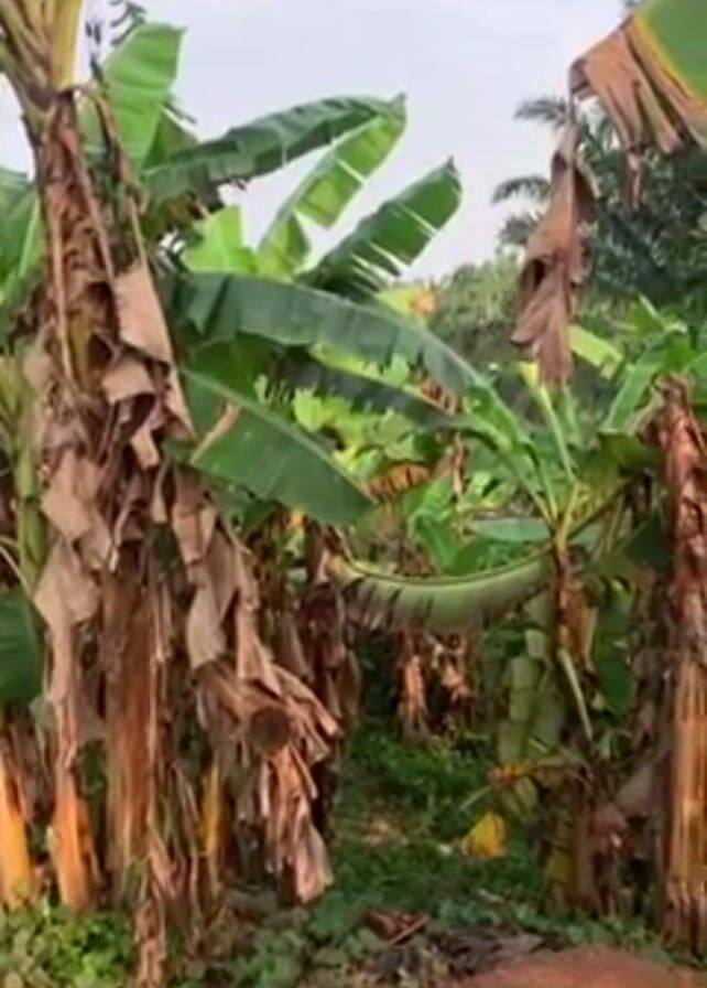 The camera pans across a dense grove of banana trees with tall, thick trunks and large green leaves, some of which are turning brown and dried out