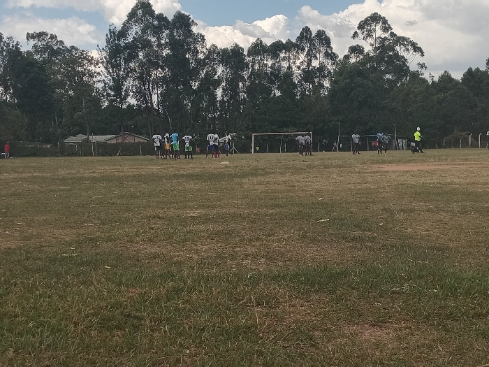 A soccer game unfolds on a grassy field under a partly cloudy sky. Two teams of players, one in lighter colors, face off. In the background, a goal is visible, with more players positioned near it. A single figure in a bright yellow shirt stands out on the right. Trees line the horizon behind the field, and a building is slightly visible behind a distant fence. The foreground features the natural uneven texture of the grass.