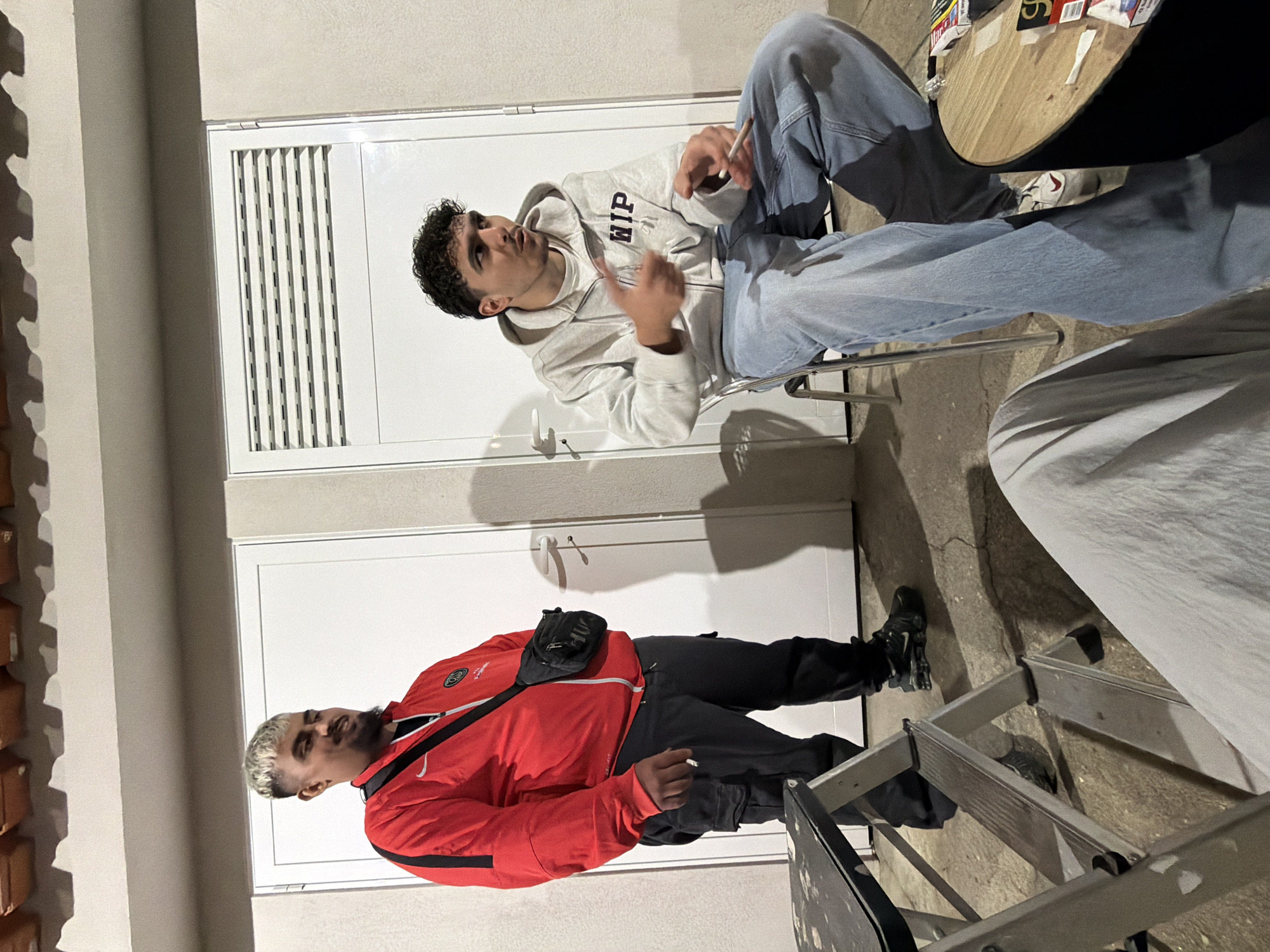 The image depicts three individuals in an urban outdoor or semi-enclosed setting in Vila Real, Portugal, at night, under artificial lighting. In the midground, a male subject with a light complexion, dark beard, and blonde-highlighted dark hair stands to the left. He is wearing a red Nike track jacket with a Paris Saint-Germain crest and "Emirates" sponsor logo, a black t-shirt, dark cargo pants, and black sneakers. A black crossbody bag hangs over his right shoulder. He holds a lit cigarette in his right hand and faces slightly right, appearing to observe the seated individual. To the right, another male subject with a light complexion and dark curly hair is seated on a metallic chair. He wears a light gray zippered hoodie with "WIP" printed on the chest, a white t-shirt, light blue loose-fitting jeans, and white sneakers. He is leaning forward, gesturing with both hands, his left hand pointing forward, and his right hand holding a white cigarette. His mouth is slightly open, suggesting he is speaking. In the foreground, the lower body and legs of a third individual, clad in light grey loose-fitting pants, are partially visible, indicating they are seated facing the other two. The background consists of a light-colored wall featuring two white doors. The right door incorporates a section of horizontal louvers. Terracotta roof tiles are visible above the wall. The ground is concrete, casting shadows from the artificial light source, which appears to be positioned high and to the left. On the lower right, a small, round table with a wooden top and dark base is present. On the table are several packs of cigarettes, including "Marlboro Red" and "Nobel" brands, along with loose cigarettes and cigarette papers or filters. A silver metal stepladder with a black top is partially visible in the lower left foreground.