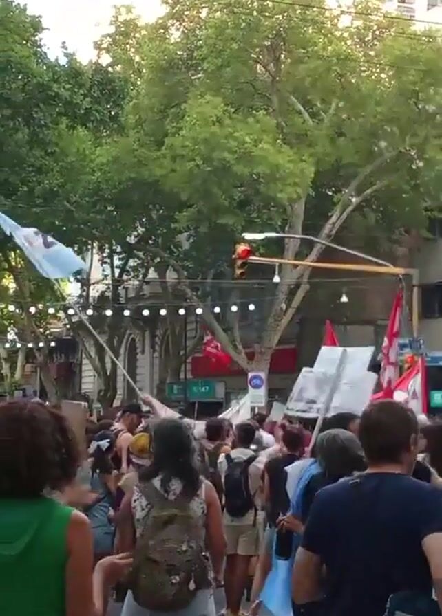 A crowd of people is marching down a city street. They are holding flags of Argentina, as well as some red flags with what appears to be political writing. There are also some handwritten signs. The street is lined with trees and tall buildings. The traffic light overhead is red. The atmosphere seems festive and possibly political.