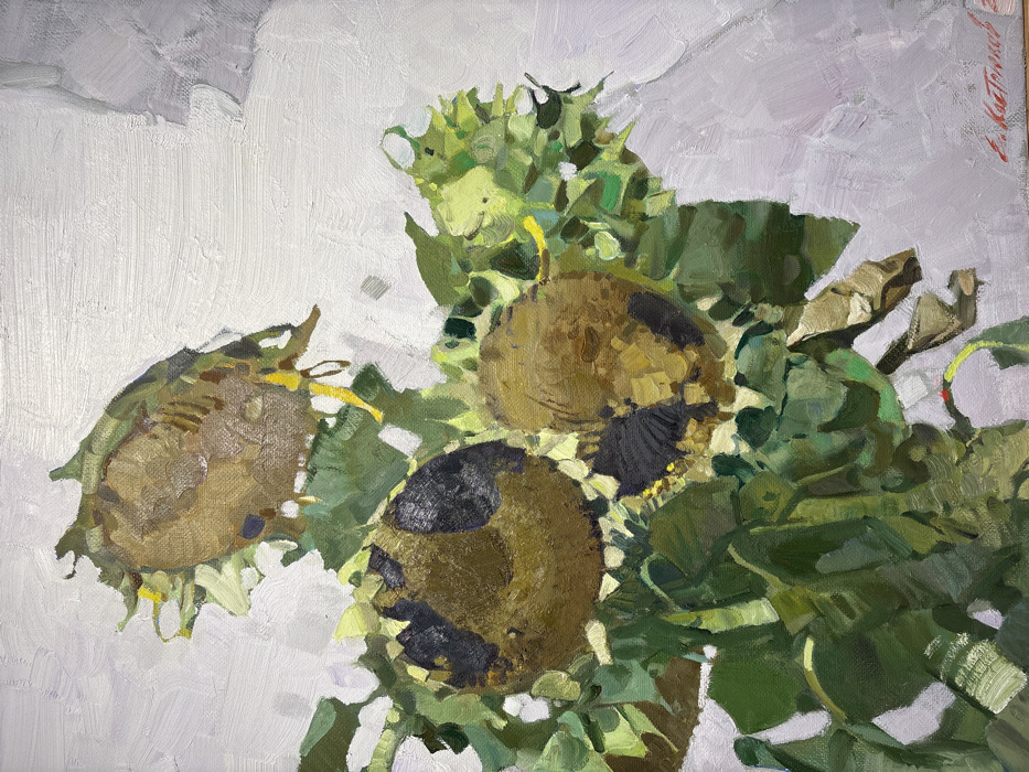 - "This oil painting depicts three mature sunflower heads with their accompanying green foliage, presented against a textured, light grey-white background" by FM-9WZ5h1, licensed under CC BY 4.0