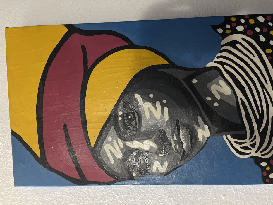 A vertical, rectangular canvas painting is depicted, mounted on a plain, light-colored wall. The painting features a stylized, head-and-shoulders portrait of an individual, rendered in a dark grey skin tone with lighter grey shading. White markings, including "Z" shapes and dots, are present on the forehead, cheeks, and chin. The eyes are prominent with white highlights, and the lips are slightly parted, revealing white lines for teeth. The subject wears a headwrap, primarily yellow with a maroon horizontal band, both outlined in black. A multi-striped black and white necklace or collar is visible, beneath which a black garment with scattered red and yellow circular patterns is depicted. The background of the painting is a solid blue. The paint exhibits textural qualities, particularly in the yellow and maroon sections. The precise dimensions of the painting are not ascertainable from the image. No visual information within the image indicates a specific location in the city of Rido, Nigeria.