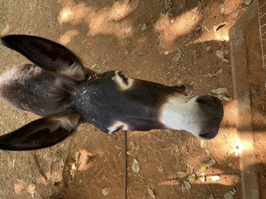 - "The image displays a dark brown donkey with a distinctive white muzzle, observed from a high-angle frontal perspective, situated in an outdoor environment in Kfar Saba, Israel" by FM-tWx7o1, licensed under CC BY 4.0