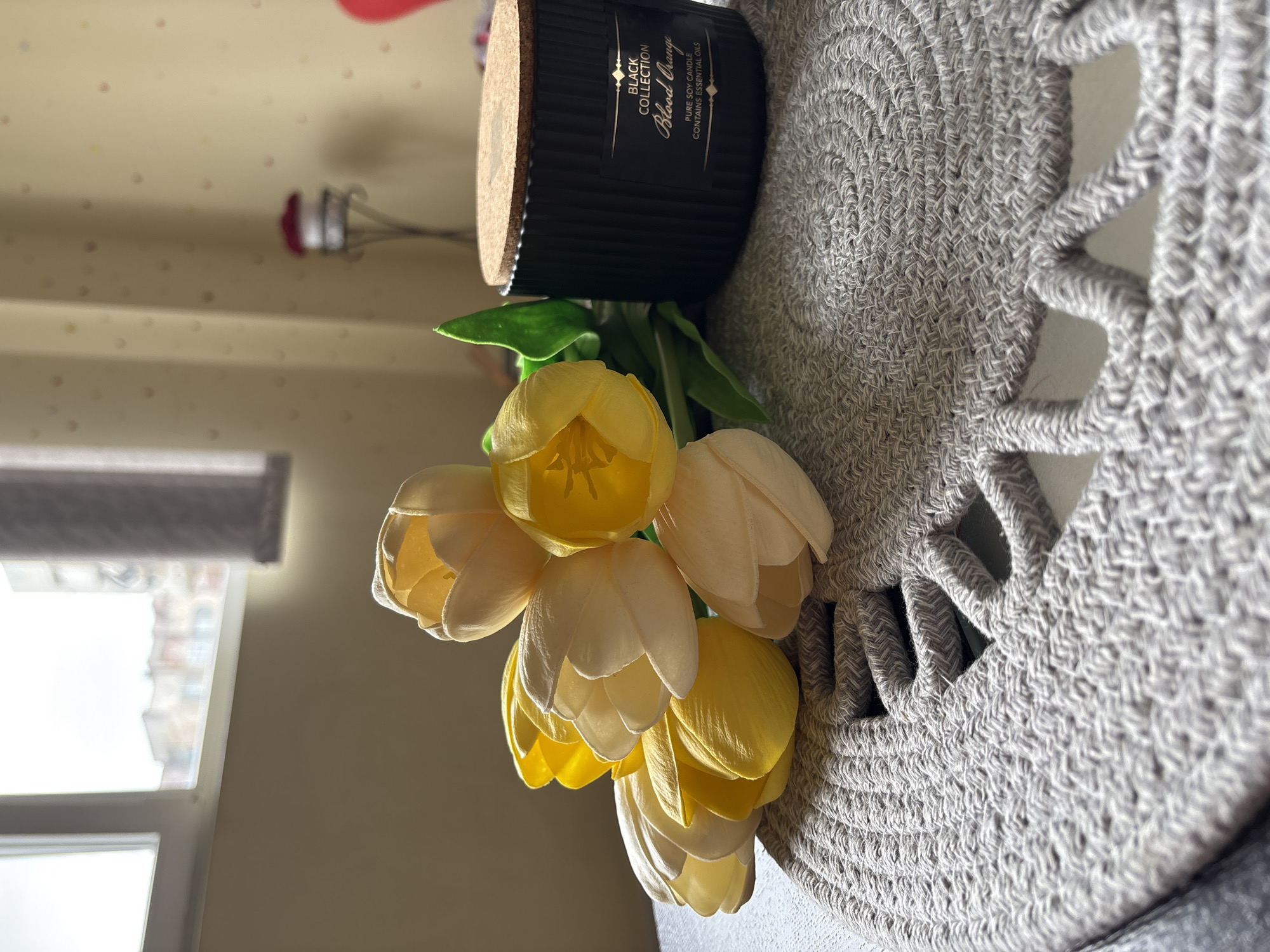 A still-life arrangement is set against a softly-lit indoor background. A black cylindrical candle with a cork lid, labelled "Black Collection Blood Orange," sits atop a light gray crocheted mat with a circular design. A bouquet of yellow and cream-colored tulips is nestled beneath the candle. The flowers appear to be artificial. A window is partially visible in the background, suggesting an urban location, possibly in Sliven, Bulgaria. The scene is captured at an oblique angle, rotated slightly.