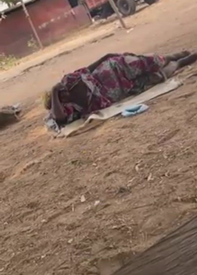 woman lying on a mat on the ground. She is wearing a floral print dress. Her head is resting on her hand. There is a pair of sandals near her head. Behind her, there is a red shack and a truck with a red trailer. The ground is dirt. There is a wooden surface in the bottom right corner of the frame.