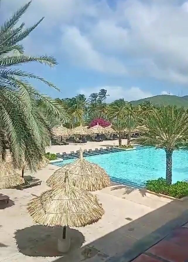 The video pans slowly across a tropical resort