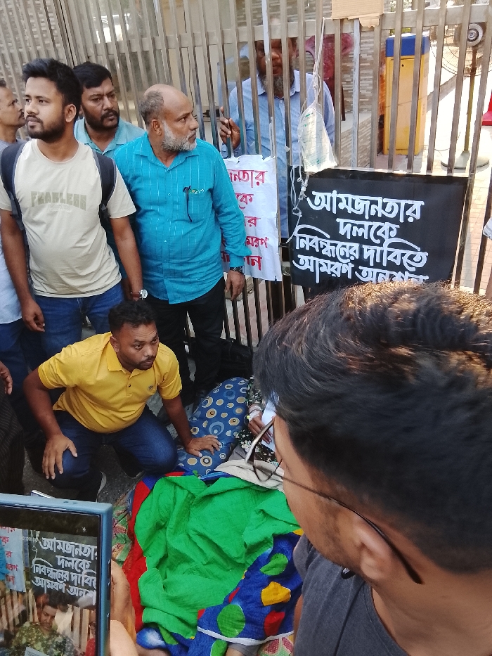 An outdoor scene in Dhaka, Bangladesh, depicts a protest or demonstration occurring in front of a metal barrier or gate during daylight hours. Approximately seven adult males are visible. In the immediate foreground, the back of a man's head, wearing glasses and a dark grey t-shirt, is seen as he holds a smartphone, actively recording the event on its screen. In the mid-ground, a group of men stands near a person lying on the ground. To the left, a young man with a black backpack and a light tan t-shirt bearing the word "FEARLESS" stands, looking towards the left. Behind him and slightly to his right, another man in a blue shirt is visible. Centrally, a bald man with a grey beard, wearing a teal striped button-up shirt, observes the scene to his right. Kneeling on the ground next to the prone individual is a man in a yellow polo shirt and blue jeans, looking right. The person lying on the ground is mostly obscured by a green blanket and patterned blue fabric, with an IV drip bag suspended from the metal barrier connected to their arm, suggesting medical intervention for a hunger strike. Behind the participants, a black protest sign with white Bengali text reads, "আমজনতার দলকে নিবন্ধনর দাবিতে আমরণ অনশন" (Aamjonotar Dal Ke Nibondhoner Dabite Amaron Onoshon), translating to "Hunger strike demanding registration of the common people's party." A partial white sign with Bengali text is also visible. Beyond the metal barrier, which appears to be part of a gate system, another man is partially visible, along with a yellow barrier arm and a fan.
