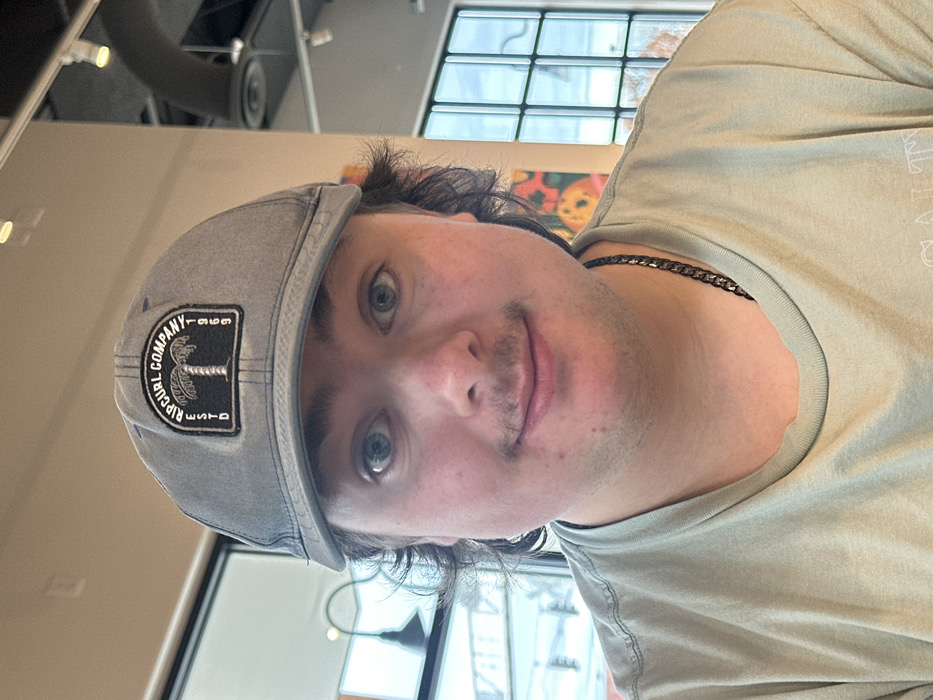 This image presents a frontal portrait of a young adult male situated within a cafe or similar establishment in Medford, United States