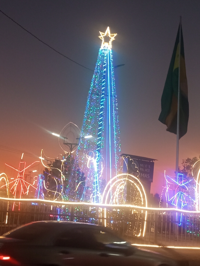 The photo depicts a night scene with Christmas decorations. A tall Christmas tree, illuminated with blue and multicolored lights and topped with a star, stands prominently. To the right, a flag flies on a pole. The foreground features decorative lights forming arched shapes and other abstract designs. A car appears blurred in motion at the bottom. "M.E.E.S. PALACE CINEMAS" is faintly visible in the background. The sky is a dusky gradient.