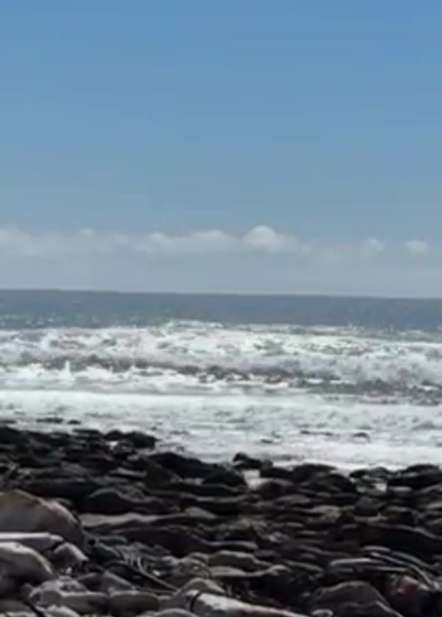 rocky beach on a sunny day. The foreground is composed of dark, rough rocks and some lighter, rounder stones. The ocean stretches into the distance, with waves breaking in the middle ground. The sky is a clear blue, with a few scattered clouds near the horizon.