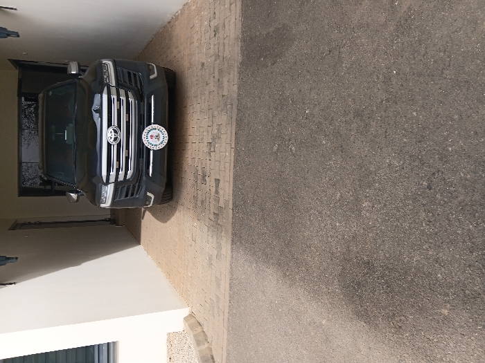 A black Toyota Land Cruiser 300 Series SUV is parked head-on within a light-colored carport or garage entrance in Unguwan Sanusi, Nigeria