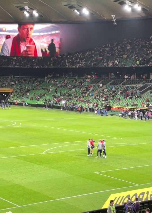 soccer field in a packed stadium. Several players are practicing on the field, wearing red and blue uniforms. A corner flag with a white, yellow, and blue design is visible near the edge of the field. A large video screen displays an image of a person. There are many spectators in the stands, and the scene captures the pre-game atmosphere of a soccer match.