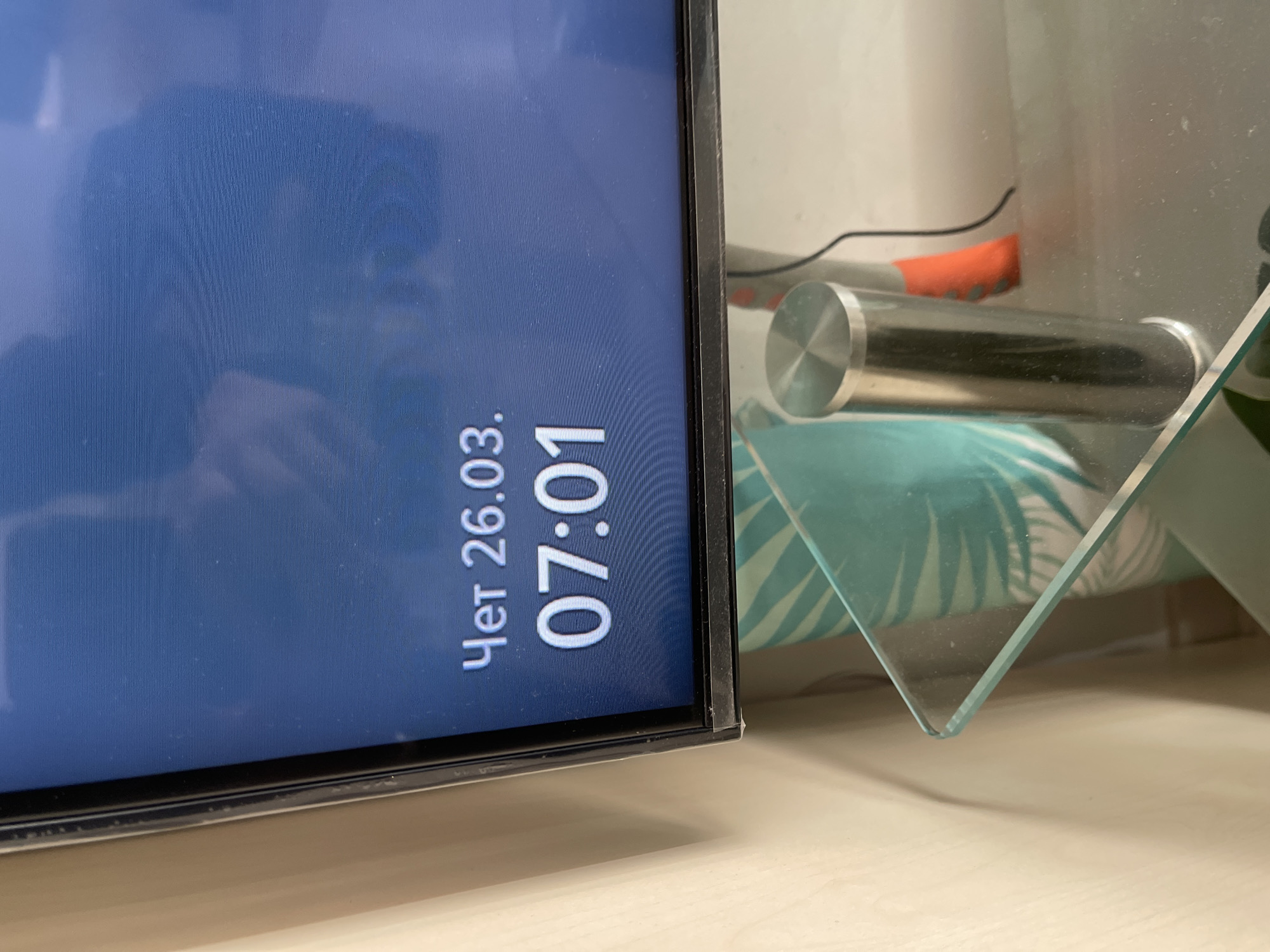 An indoor scene, located in Sofia, Bulgaria, is depicted, showing the lower portion of a television screen and objects positioned beneath it. The television screen displays white text against a blue background, indicating "Чет 26.03." (Thursday, March 26th) and "07:01" (7:01). Horizontal scan lines are visible across the display. The screen is bordered by a black bezel, which exhibits minor dust accumulation along its lower edge. Below the television, a clear glass shelf, part of a multi-tiered stand, is visible. A cylindrical, brushed metal support post for the stand is positioned on the right. Beneath the glass shelf, a fabric with a blue and white tropical leaf pattern is discernible, alongside an orange object, possibly a garment, and a black electrical cable resting on a light-colored surface. A light-toned wall or furniture panel is present to the left of the television. No individuals or specific actions are visible.
