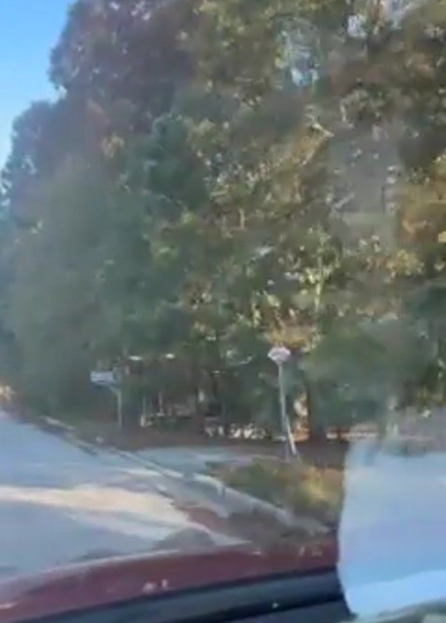 driver's perspective from inside a red car moving along a gray paved road. On either side of the road are rows of lush green trees, their branches creating a dense canopy. The sky is a clear, bright blue, suggesting a sunny day. A few utility poles with power lines are visible amongst the trees. The dashboard of the car is visible at the bottom of the frame, with a tissue box placed on top of it. The overall impression is of a peaceful drive down a quiet, tree-lined street.