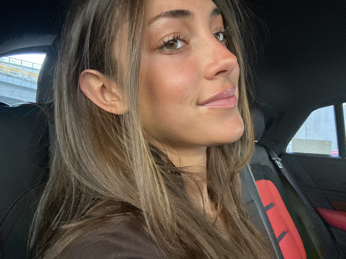 A light-skinned woman with brown hair is captured in a car interior. She has light brown eyes, a distinct nose, and her lips are slightly glossy. Her hair is styled loosely around her face. The car's interior features black leather seats with red and silver accents. An exterior view of what appears to be a bridge can be seen through the car window.