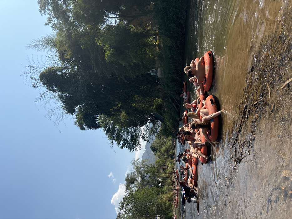 A group of people float down a river in orange inner tubes. Trees line the river bank on both sides with a clear blue sky overhead. Some tubers are linked together, while others drift separately. The water is murky and shallow, revealing a rocky riverbed near the shore. Mountains are visible in the distance.