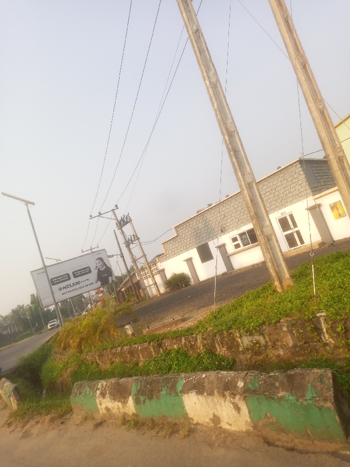 A street scene displays utility poles and wires against a hazy sky. A building with a block facade and white trim sits on a grassy slope. A large billboard features an advertisement. A partially visible road runs parallel, lined with a low, weathered concrete barrier. A street light stands near the road. The composition is slightly tilted.