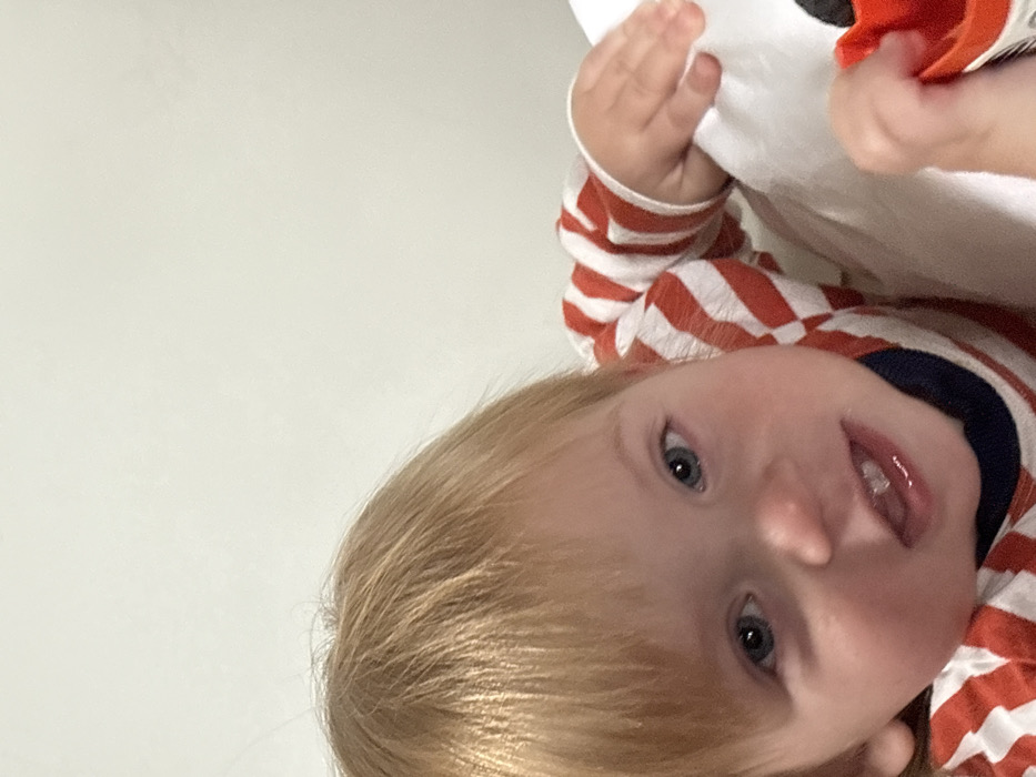 The image captures an infant with blonde hair and blue eyes, positioned in a close-up, slightly upward-angled view. The infant is looking directly at the camera with an open-mouthed expression, revealing two lower incisors. The subject wears a long-sleeved shirt featuring horizontal red and white stripes and a visible navy blue collar. The infant's right hand grasps a portion of an orange object, which appears to be a cup or toy. The left arm rests on a white, soft object, possibly a pillow or stuffed animal, visible to the right of the infant. The background is a plain, light-colored surface, indicative of an interior wall. No specific environmental or structural features are present within the image to identify a location within the city of Erba, Italy.