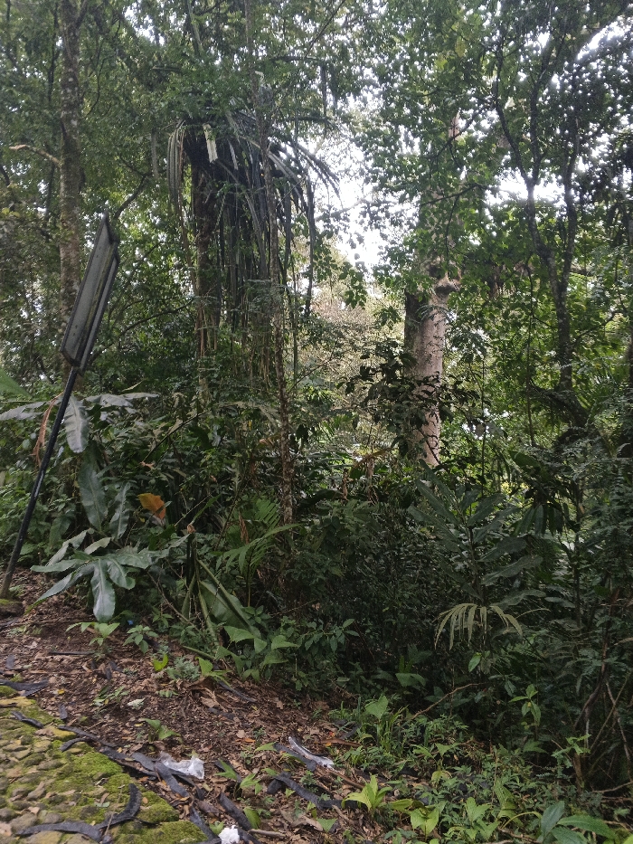 The image depicts a densely vegetated, outdoor environment in Lalitpur, Nepal, resembling a forest or jungle edge. The scene is dominated by a multitude of trees and undergrowth. Tall, broad-leafed trees with visible trunks, including one particularly large tree with light-colored bark in the mid-background, form a thick canopy overhead, allowing dappled light to filter through. Numerous smaller trees, shrubs, and various green plants, some with large leaves, constitute a dense layer of undergrowth across the mid-ground and foreground. Long, dark, vine-like structures hang prominently from the trees in the upper-left and center. In the lower-left quadrant, a dark, rectangular sign or panel is affixed to a pole, angled upwards and to the left. The sign's surface shows some glare, and no discernible text or imagery is visible. The ground in the foreground consists of reddish-brown soil covered with fallen leaves and organic debris. In the bottom-left corner, a section of a paved or cobbled surface, partially covered with moss and small green growth, is visible. Several pieces of white plastic debris, appearing as refuse, are scattered on the ground near the paved area. No people or animals are present in the scene, and no specific actions or interactions are depicted.