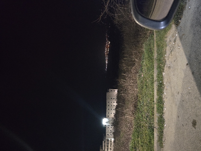 The image depicts a nighttime scene in Byala, Bulgaria, observed from a low vantage point, likely from within or immediately beside a stationary vehicle. The foreground consists of an unpaved or poorly maintained road surface, heavily littered with numerous white cigarette butts. Immediately beyond this, a narrow strip of green grass separates the road from a dense, unkempt area of overgrown, dry brush and bare tree branches, suggesting a dormant state of vegetation. In the midground, beyond the brush, stands a multi-story, light-colored building, possibly a residential block or hotel, with multiple illuminated windows and exterior lights. The upper portion of this building is brightly lit, contrasting with the dark sky. In the distant background, a sprawling cluster of orange and white artificial lights indicates a populated area or the further extent of Byala. The sky overhead is completely dark and devoid of visible celestial bodies. A portion of a car's grey side mirror is visible in the lower right corner, reflecting a distorted view of the immediate surroundings. No individuals or active subjects are discernible within the frame.
