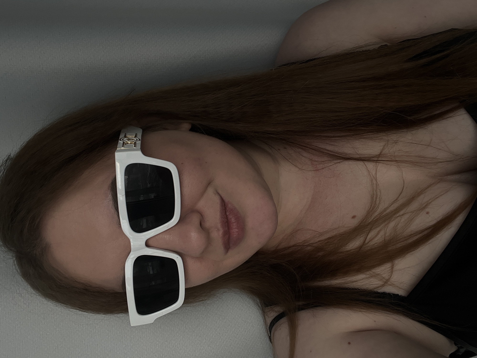 A woman with light skin and reddish-brown hair is reclining against a light grey or white surface. She is wearing oversized, square-framed white sunglasses with black lenses. Part of her upper chest and shoulder are visible, covered by a black garment with lace trim along the neckline. The image is taken at a close range and rotated counter-clockwise. No specific location in Chaikovsky, Russia can be determined from the image.