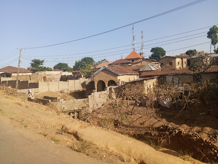 The image displays a panoramic view of a residential and construction area along Rukuba Road, Nigeria, under a clear, bright blue sky. The foreground consists of dry, reddish-brown earth with sparse, dormant vegetation, sloping downwards towards a visible segment of a paved road on the far left. In the midground, an active construction site occupies the left and central portions, characterized by numerous concrete block walls forming foundations and partially erected structures. Piles of reddish-brown earth are interspersed within this area, alongside stacks of concrete blocks. A single individual, appearing to be an adult male wearing a light-colored shirt and dark trousers, is visible standing or walking on concrete blocks within the construction zone. To the right of the construction site, a cluster of older, single-story residential buildings with light-brown stucco or mud-brick walls and varying roof types, including corrugated metal and reddish-brown tiles, are present. Some structures show signs of weathering, and one prominent building features a distinct arched entryway. Bare-branched trees and shrubs are scattered across the dry landscape, particularly among the older dwellings. The background reveals additional residential buildings and, prominently, two tall, red and white striped communication towers rising above the rooftops against the horizon. Overhead power lines, supported by dark utility poles, traverse the upper-left portion of the scene.