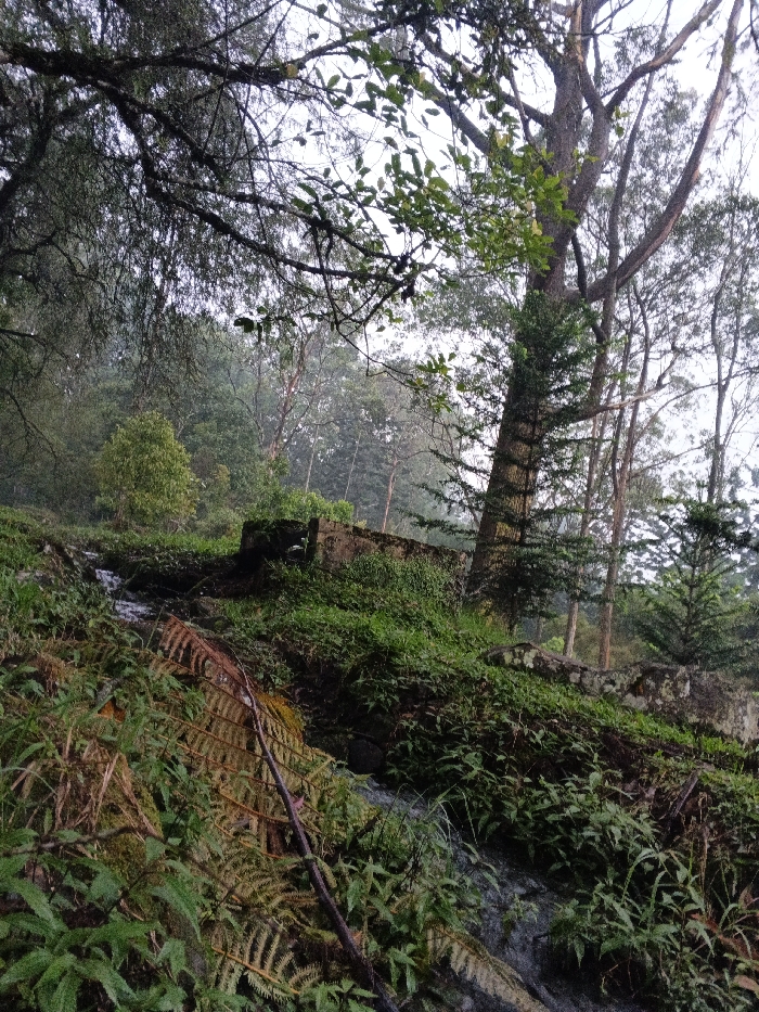 Lush green forest scene with dense vegetation and tall trees reaching towards a cloudy sky. A small stream cascades over rocks covered in ferns and moss. A crumbling stone structure is partially concealed by the foliage, adding an element of mystery to the landscape. The overall atmosphere is serene and slightly misty.