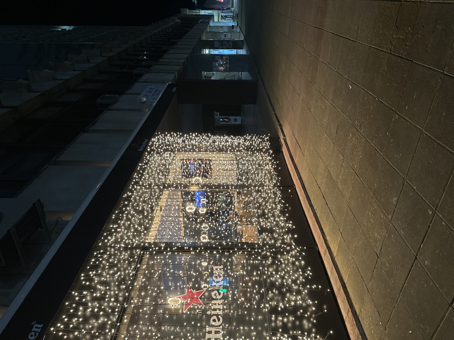 The scene depicts a nighttime view of a commercial establishment in Kyustendil, Bulgaria. The left side of the image features a storefront extensively covered with vertical strands of white-yellow LED string lights, creating a luminous curtain effect across its large glass windows. Through these lights and the glass, a prominent red star 'Heineken' logo is visible on the left, along with other interior lights and reflections. A dark awning extends above the storefront. The ground consists of a paved sidewalk made of square, dark grey concrete tiles, extending from the bottom foreground towards the background on the right. To the right of the illuminated storefront, the building facade continues into the distance, revealing multiple stories with dark windows and structural columns that create shadowed recesses. A white payment terminal or ATM-like unit is partially visible recessed into the building wall to the right of the lit store. Further down the street, distant artificial lights from other establishments cast faint glows. The sky is dark, indicating night, and no individuals or vehicles are visible in the immediate foreground or midground.