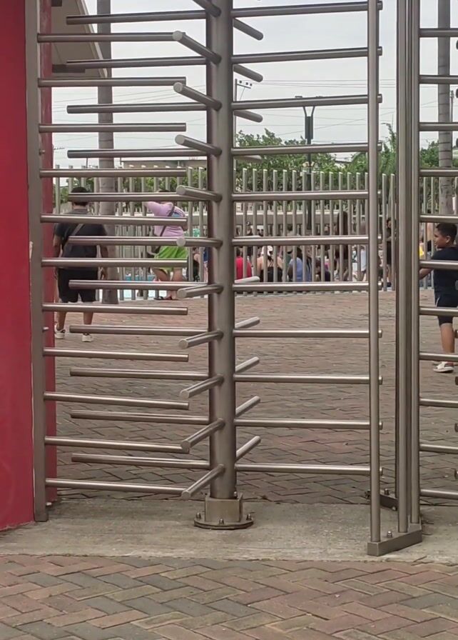 close up of a metal turnstile leading to an outdoor pool area. The turnstile is made of silver horizontal and vertical bars. A red wall borders the left side of the turnstile. The ground in front of the turnstile is brick. In the background, people are visible around the pool, standing and sitting. Some wear swimwear. The sky is overcast.
