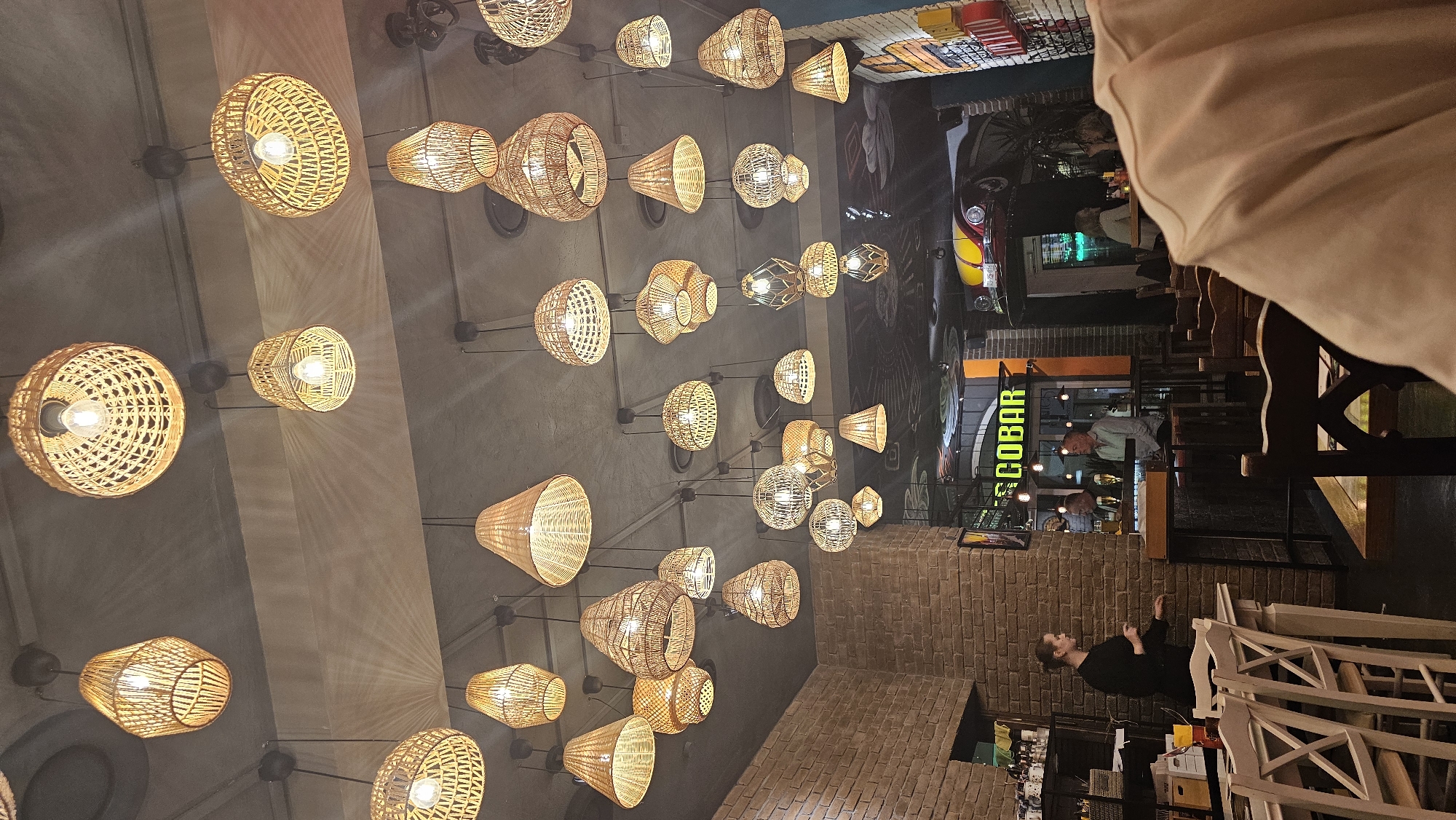 The image displays the interior of Escobar, a restaurant and bar located at Sandgasse 20, 63739 Aschaffenburg, Germany. The ceiling, painted dark grey, is extensively adorned with numerous illuminated wicker and rattan lampshades of various shapes, including round, conical, and teardrop designs, suspended by black cords. Exposed brick walls form much of the structure. In the mid-ground left, a female staff member with light hair, dressed in a dark top, stands behind a service counter, appearing to gesture with her hands. Adjacent to her, shelves hold bottles and other service items. Further into the establishment, a prominent green neon sign displays "ESCOBAR." Below this sign, two men are seated at a high-top table, each with a glass of beverage. One man wears a light-colored shirt, the other a darker one; both appear to be engaged in a conversation. A distinct decorative element is an inverted yellow and red vintage Volkswagen Beetle car mounted on a wall above a distant doorway or archway, to the right of the seated men. Another brick wall section on the far right features colorful artwork or murals. The foreground includes the shoulder and upper back of a person, likely the photographer, wearing a light peach or beige shirt. White wooden chairs with X-back designs and corresponding tables are visible in the lower left foreground. The overall lighting is warm, emanating primarily from the numerous ceiling fixtures.