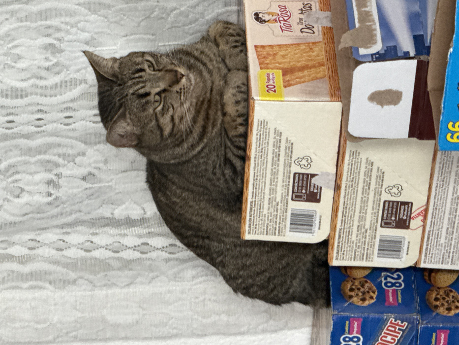 - "A tabby cat rests beside a stack of packaged goods on a white, lace-patterned surface" by FM-BAhUf2, licensed under CC BY 4.0