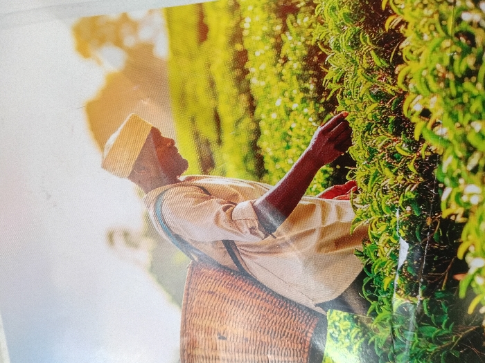 An individual, presumed male, with dark skin, wearing a light-colored long-sleeved shirt, dark trousers, and a light-colored cap, is depicted in a tea plantation in Limuru, Kenya