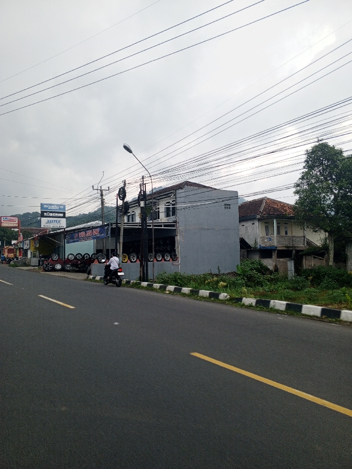 The image displays a street scene under an overcast, light grey sky. The depicted location is Indonesia, as indicated by visible signage for "Alfamart" and "Surya Jaya Ban," contradicting the requested location of Qorday, Kazakhstan. In the foreground, a dark asphalt road runs horizontally, marked by a solid yellow line on the right side of the visible lane. A black and white striped curb separates the road from a narrow, unkempt strip of ground with green vegetation. In the midground, a commercial area lines the road. A two-story building, with a light grey lower facade and white upper sections, operates as a tire shop. Its ground level prominently displays numerous car alloy wheels and tires, arranged horizontally along the facade and vertically on racks. A dark blue awning extends over a portion of this display, beneath which a red, partially stripped vehicle chassis with multiple wheels is oriented perpendicularly to the road. To the left of the tire shop, a commercial strip includes a building with a red roof, identifiable by an "Alfamart" sign, and additional signs for tire brands "ZEETEX" and "ACCELERA," as well as "SURYA JAYA BAN." To the right of the main tire shop, an older, light-colored two-story residential building features a terracotta-tiled roof and a second-story balcony with a blue railing. Overgrown vegetation surrounds its base. Further to the right, a large tree with dense green foliage stands. Distant hills or mountains are visible on the far left horizon. A single individual, wearing a white shirt and dark pants, is operating a white motorcycle with a red taillight, moving from left to right on the road in front of the commercial establishments. Numerous utility poles and a dense network of overhead power or communication lines crisscross the upper portion of the image. A black streetlamp with its luminaire is positioned above the curb line, slightly right of the frame's center.