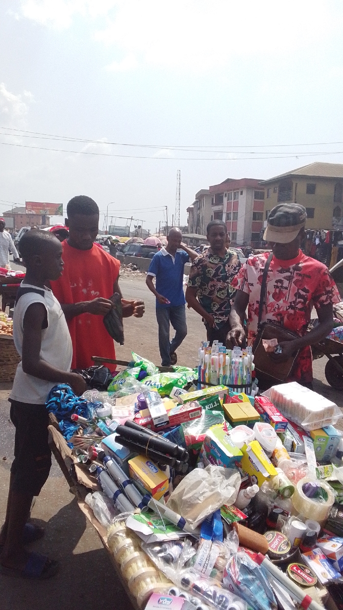 - "A street vendor's table overflows with an assortment of goods, from toothpaste and toothbrushes to tape and batteries" by FM-Jqbih2, licensed under CC BY 4.0